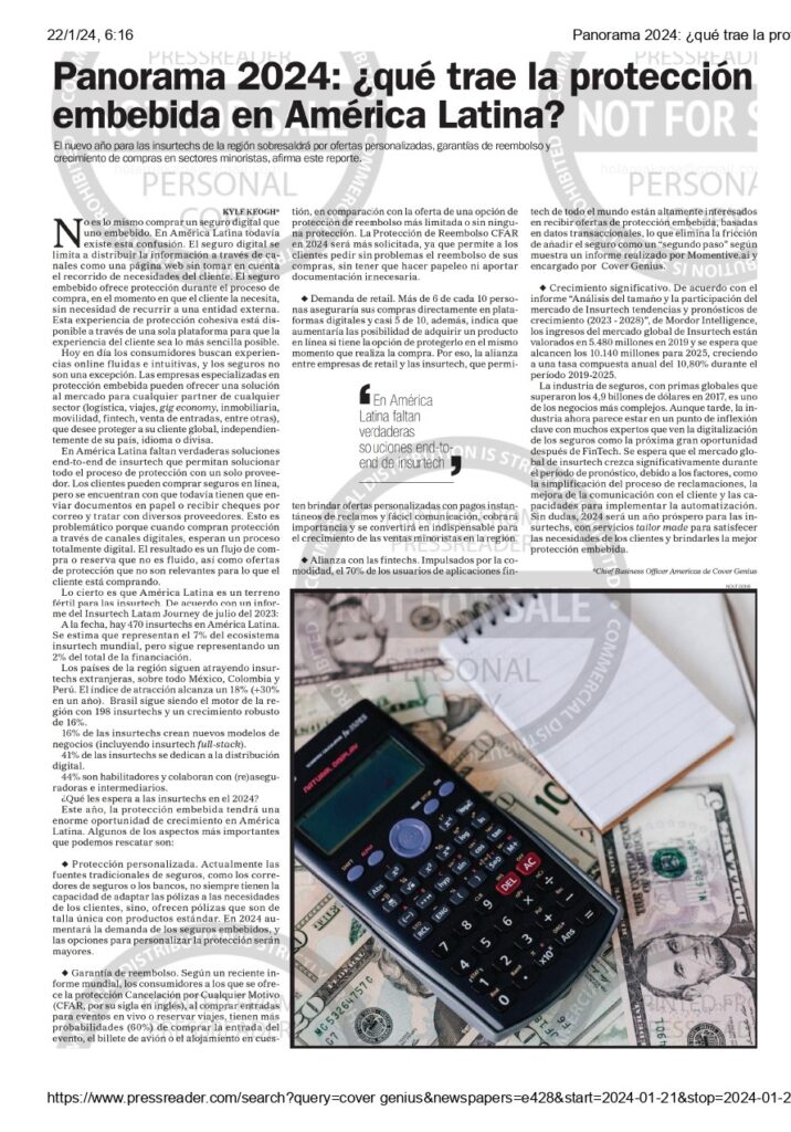 Cover Genius es la insurtech para la protección embebida, con clientes globales pertenecientes a las mayores compañías digitales del mundo, como Booking Holdings, propietaria de Priceline y Booking.com, Despegar, Intuit, Ryanair, Uber, Volaris y Descartes ShipRush, así como Amazon, eBay, Wayfair y más.